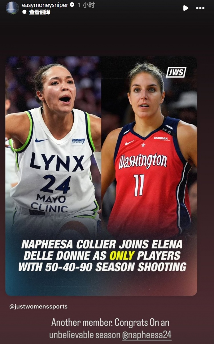 科利尔比肩艾琳娜-戴尔-多恩,成为WNBA历史唯二单赛季180俱乐部的球员。